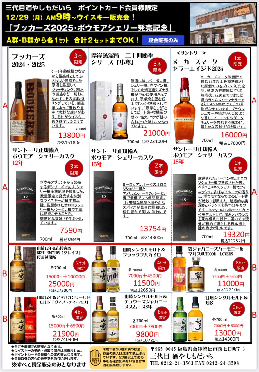 ウイスキー販売会のご案内 【ブッカーズ2025・ボウモアシェリー販売記念】日時:2025.12.29(月) AM9時~ 皆さまこんにちは♪ 今年最後のご案内になります。 今年一年、ご愛顧いただきまして誠にありがとうございました。 ◆日時 2025.12.29(月) AM9時~ (駐車場開放AM7時)◆ポイントカード会員様限定◆イスや物を置いての場所取りは無効です。それでは皆さまのご来店お待ちしております