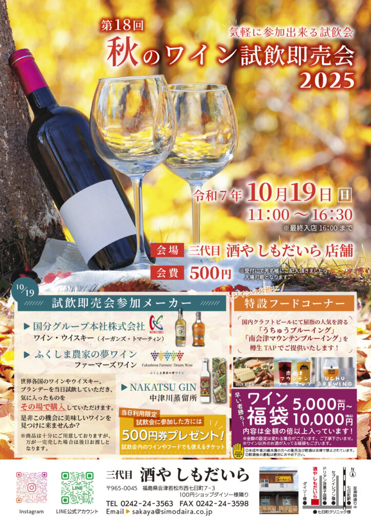 第18回 秋のワイン試飲即売会 2025 2025年10月19日(日)に、秋のワイン試飲即売会を開催いたします。お気軽にお越しくださいませ。 今回はワインをメインにしながらも、ウイスキー、ブランデー、ジン、ラム等もご用意いたします。・お口休めに特設フードブースをご用意・クラフトビール樽出しをご提供・早い者勝ち!ワイン福袋を販売 皆様のお越しをお待ちいたしております。